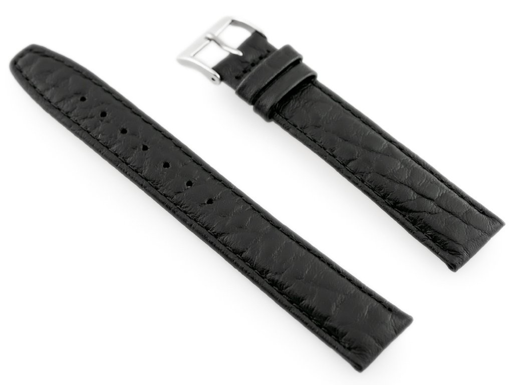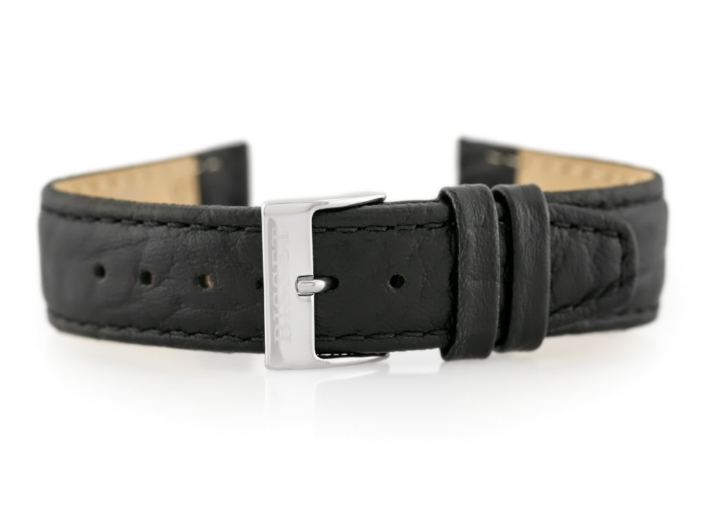Opasok z prírodnej čiernej kože s čiernym prešívaním. Kovová pracka striebornej farby.