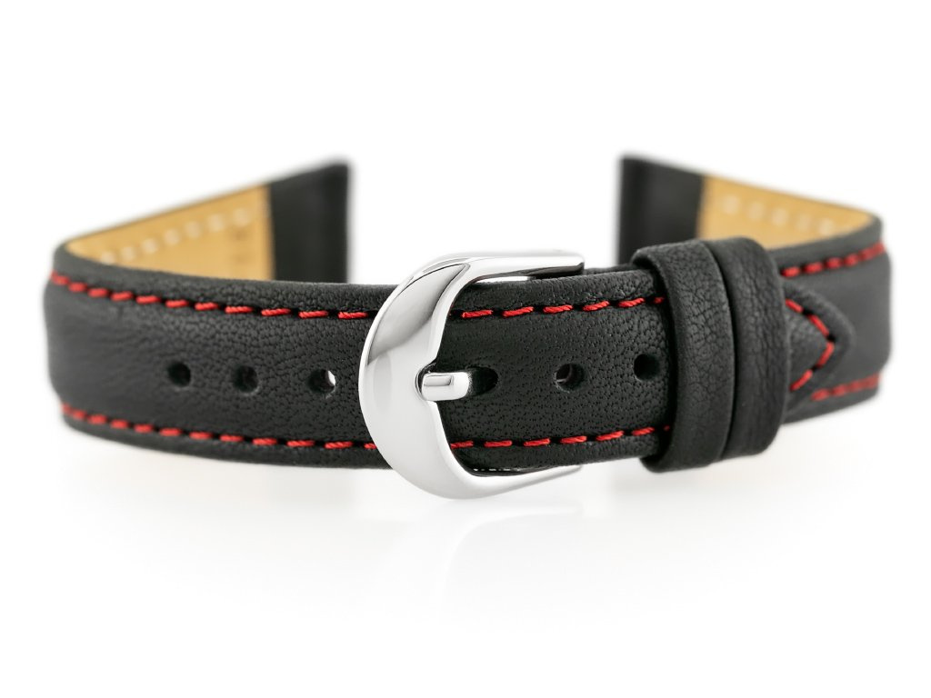Prírodný čierny kožený opasok s červeným prešívaním. Spona z nehrdzavejúcej ocele v striebornej farbe.