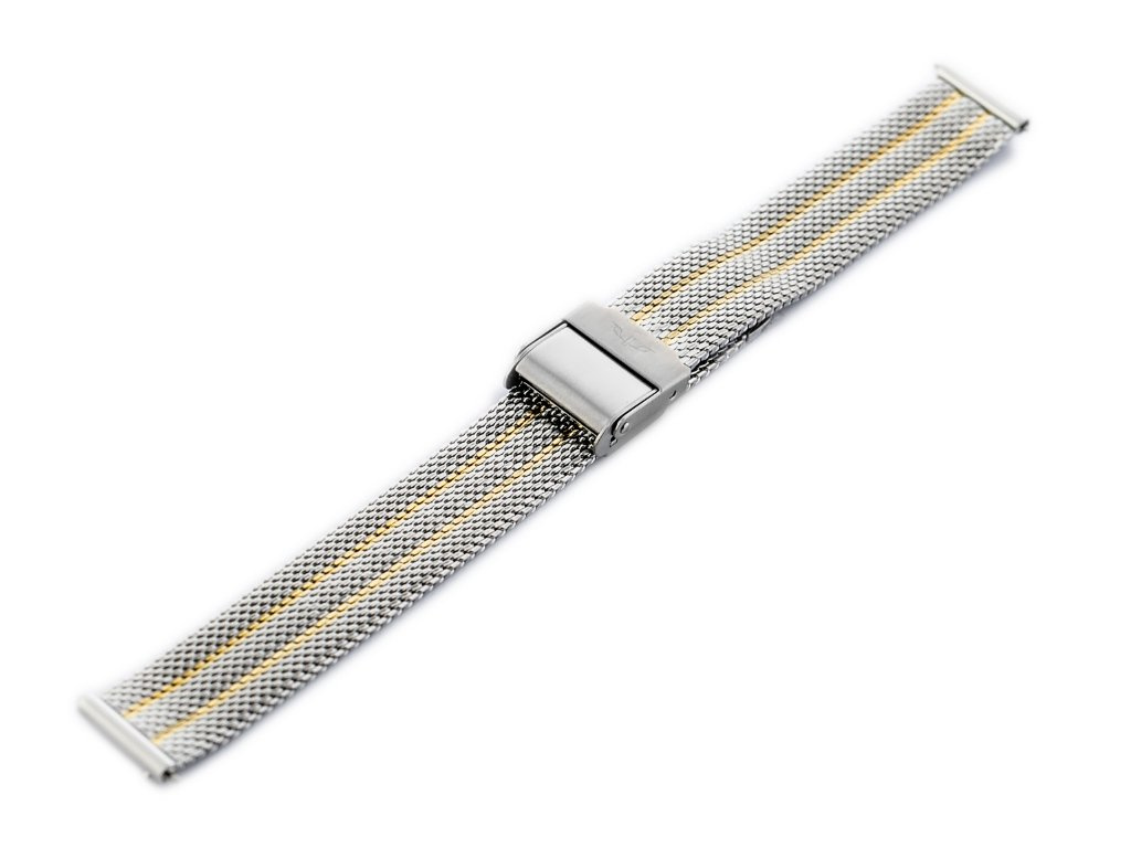 Náramok z kvalitnej ocele s klasickým zapínaním striebornej farby so zlatými prúžkami.