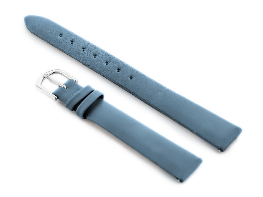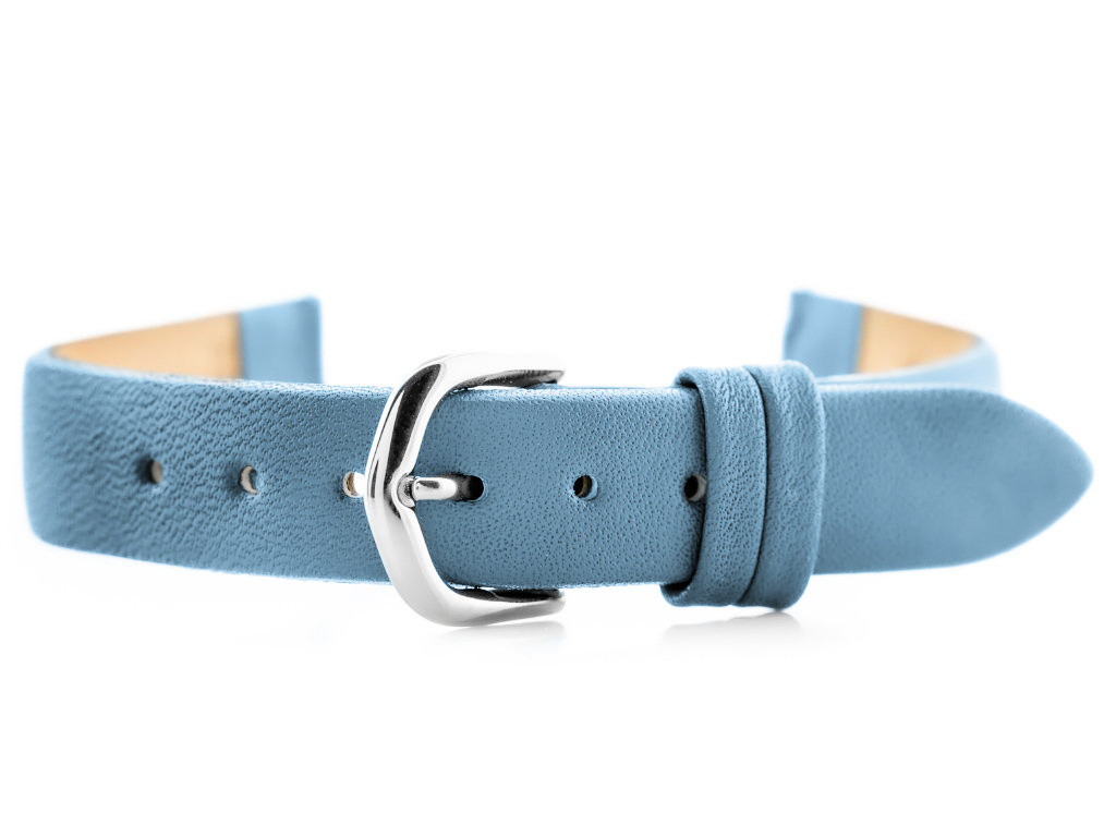 Svetlomodrý opasok z prírodnej kože. Spona z nehrdzavejúcej ocele v striebornej farbe.
