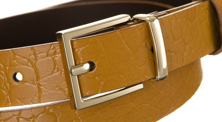 Zaujímavý dámsky kožený opasok so zlatou prackou, zvierací motív