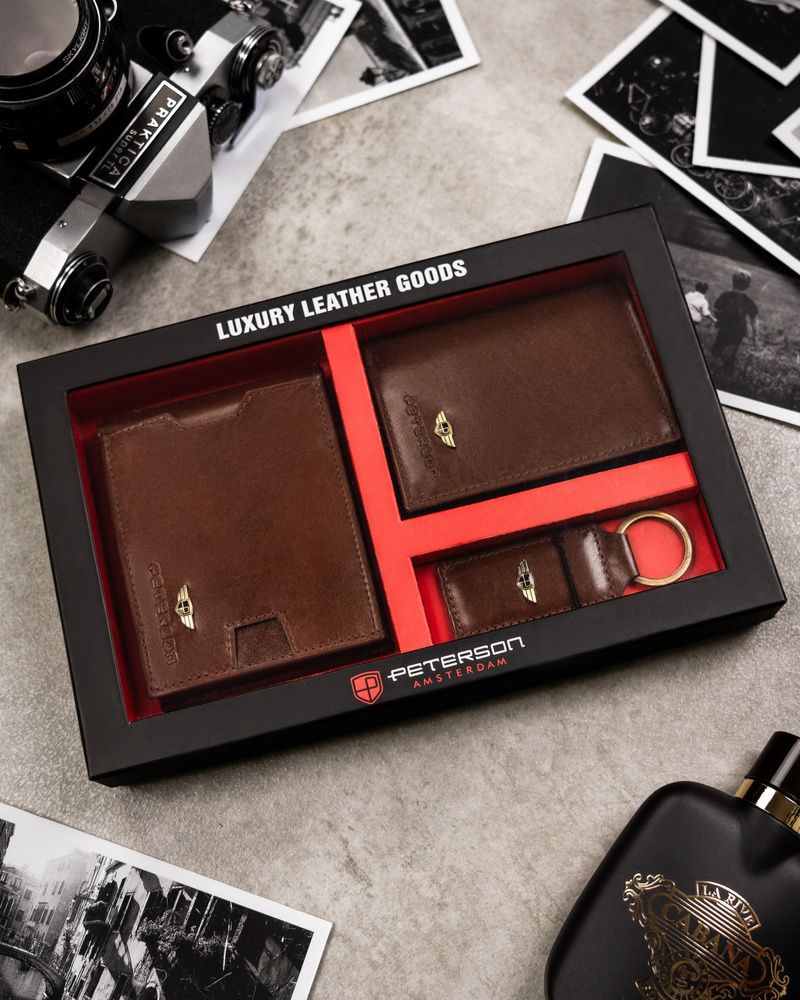 Darčeková sada: pánska kožená peňaženka, puzdro a kľúčenka