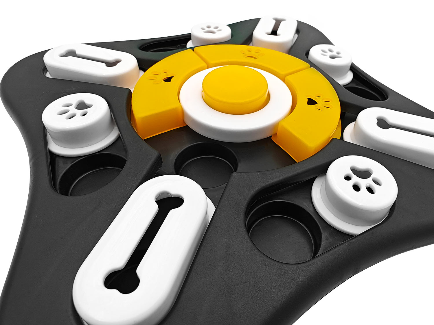 Pohyblivé časti sa otáčajú a centrálne tlačidlo vydáva zvuk. Váš pes sa tak učí logickému mysleniu, rozvíja svoje zmysly a baví sa objavovaním ďalších priehradiek s jedlom alebo pochúťkami.