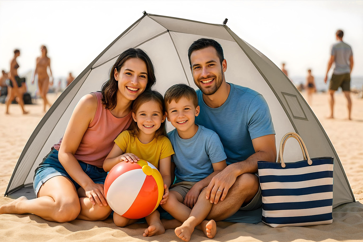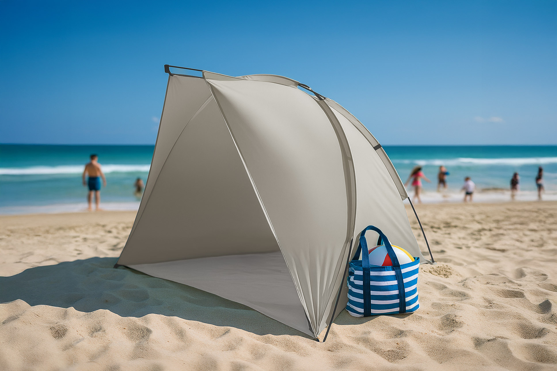 - Zaščita pred vetrom in soncem : zasnova šotora zagotavlja učinkovito zaščito pred vetrom in senco, kar je še posebej pomembno na odprtih prostorih, kot je plaža.