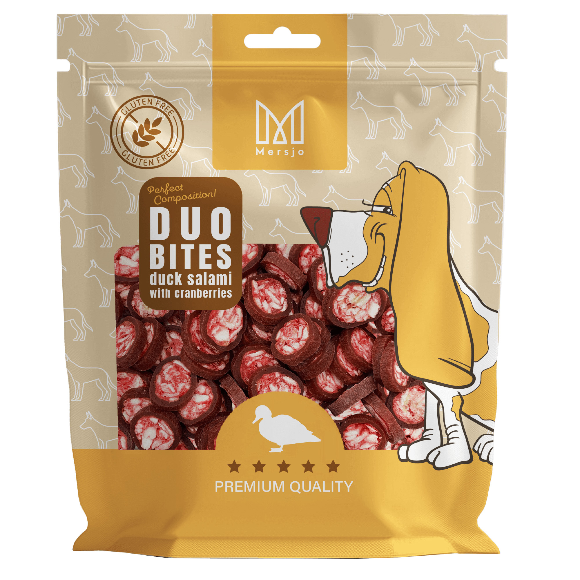 Pochúťka pre psov Duo Flavors – Kačacia saláma s brusnicami Mersjo 200g