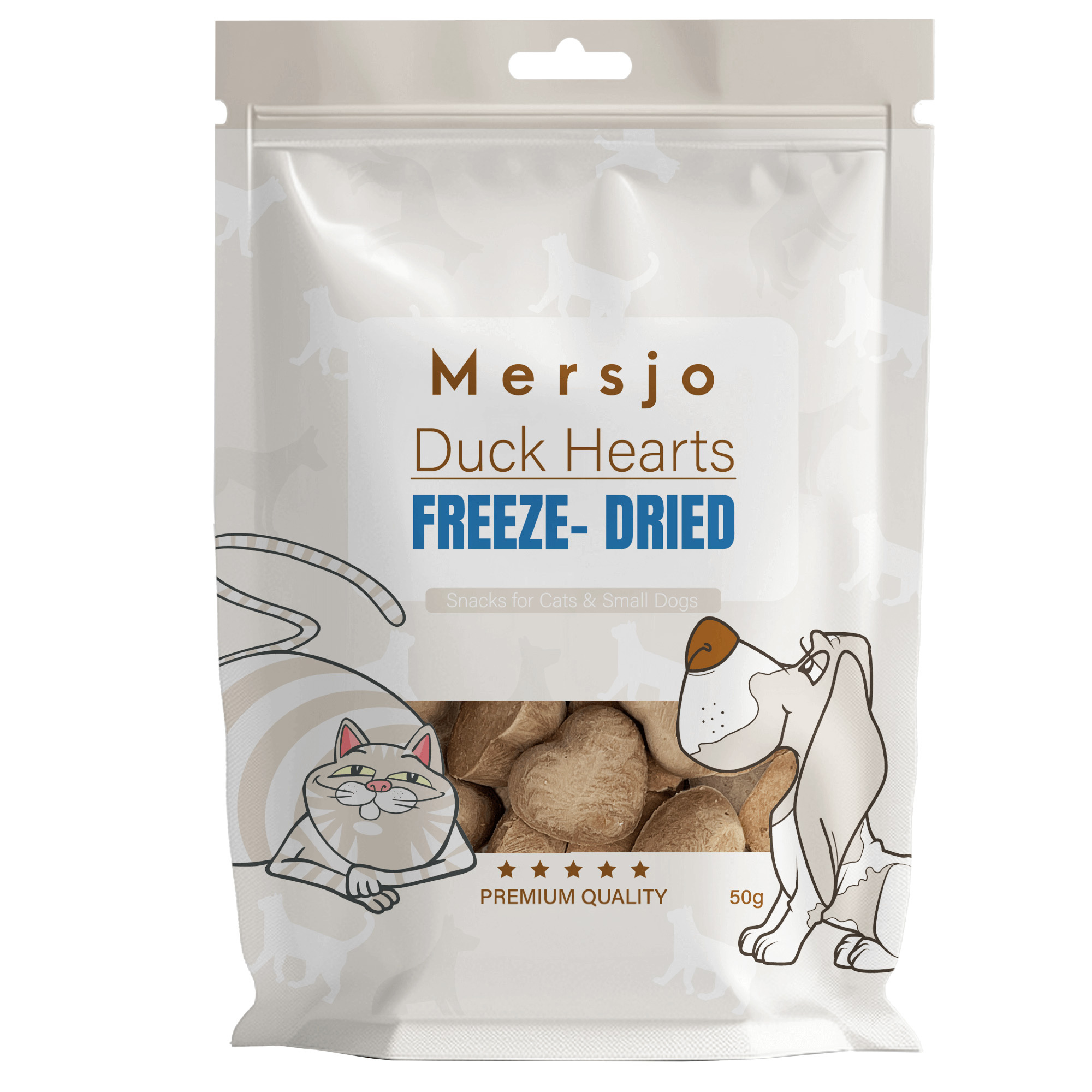 Pochúťka pre psov a mačky – Mrazom sušené kačacie srdiečka Mersjo 50g