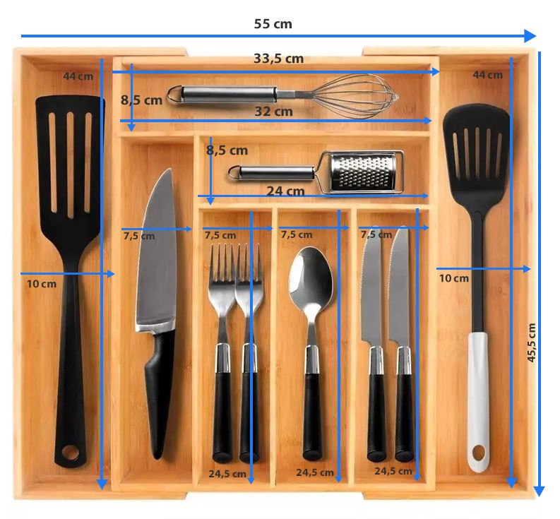 - SKLADATEĽNÝ - V našom organizéri môžete mať 6 až 8 priehradiek. Všetko závisí od toho, ako si to zariadite. Nemusíte sa obávať o ďalší priestor pre väčšie kuchynské náčinie, ako sú napríklad veľké nože.